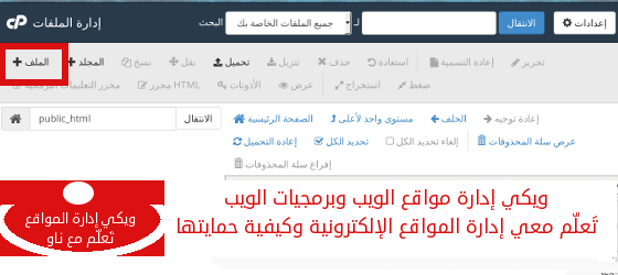 بدايةً يجب تسجيل الدخول في لوحة التحكم سي بانل، والنقر على خيار إدارة الملفات، قم باختيار خيار إنشاء ملف ( +ملف ) كما في الصورة التالية: