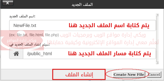 سيظهر مربع الحوار التالي بعد النقر على خيار إنشاء ملف، يمكنك الآن كتابة اسم الملف الجديد وتحديد المسار الذي تريد حفظ الملف فيه. الآن يمكنك الضغط على زر (Create New File | إنشاء الملف). سيتم إنشاء الملف بالاسم المُدخل في المسار المطلوب بعد ذلك.