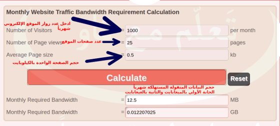 لحساب حجم البيانات المنقولة الشهري الذي يحتاجه الموقع ، يمكننا استخدام الآلة الخاصة لحساب ذلك Website Monthly Bandwidth Calculator