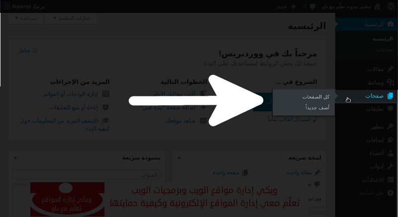 1- قم باختيار صفحات من القائمة الجانبية في لوحة تحكم ووردبريس.