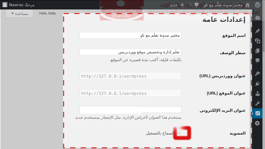 يمكنك ضبط الكثير من إعدادات ووردبريس من خلال خيار إعدادات في القائمة الجانبية. يمكن ضبط الإعدادات العامة من خلال النقر على * عام * في القائمة الفرعية لخيار إعدادات.