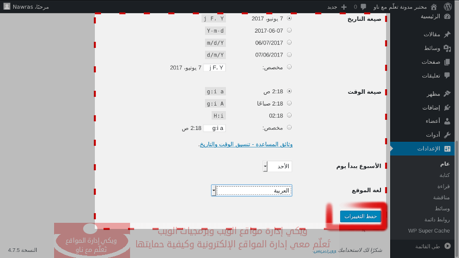 يتم تحديد لغة الموقع من خلال خيار *لغة الموقع * في أسفل صفحة الإعدادات العامة.