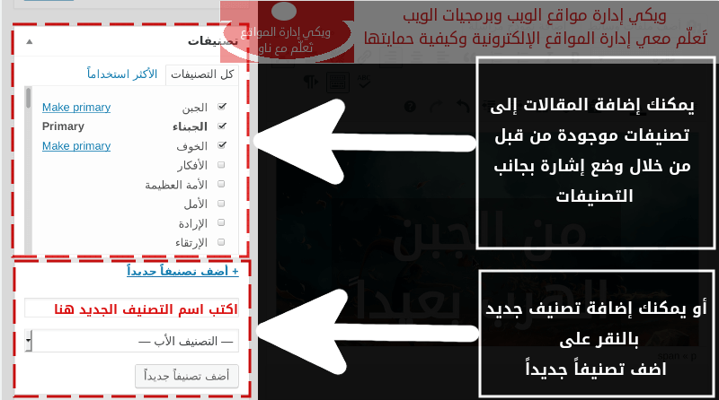 يمكنك تحديد التصنيفات أو إضافة تصنيف جديد للمقالة بكل سهولة كما يبدو في الصورة التالية: