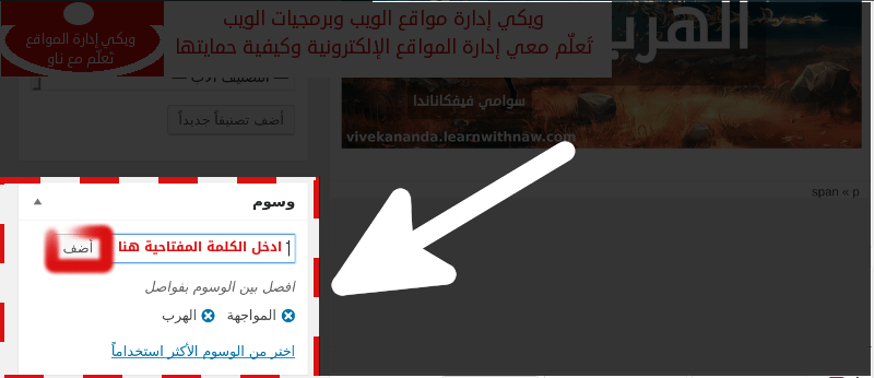 من الأفضل إضافة كلمات مفتاحية أو وسوم تعرّف بها محور المقالة او المنشور. يمكن ذلك من خلال مربع الوسوم الموجود أسفل مربع التصنيفات.