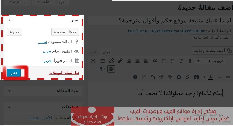 بعد كتابة المقالة وتنسيقها وإضافة كل التعديلات، لابدّ من نشرها للجمهور العام من خلال النقر على خيار نشر في الصندوق الجانبي لصندوق نص المقالة.