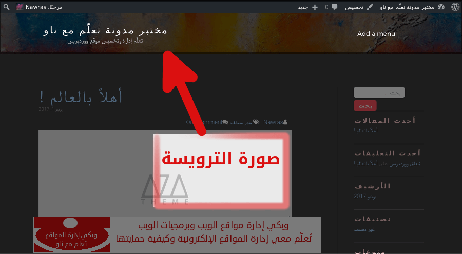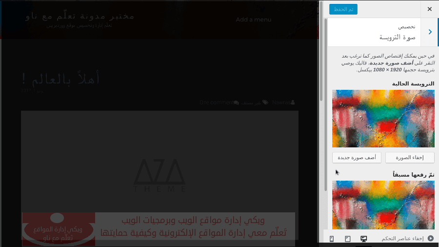 لإضافة صورة ترويسة للموقع، قم باختيار صورة الترويسة من صندوق تخصيص الموقع. ثم قم برفع الصورة التي تريد.