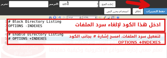 لإلغاء سرد مسارات الموقع الإلكتروني، يجب التعديل على ملف HTAccess, لمعرفة كيفية التعديل على هذا الملف، الرجاء الإطلاع على شرح كيفية التعديل على ملف HTAcess.