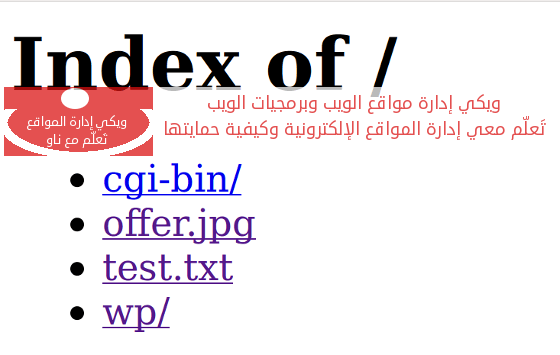 عند دخولك إلى موقعك الإلكتروني (عن طريق كتابة اسم النطاق www. your domain. com في خانة العنوان في المتصفح)، ستجد محتويات موقعك الإلكتروني من ملفات ومجلدات مسردة أمام الجمهور العام.يظهر في الصورة أدناه أن هذا الموقع يحتوي على صورة بعنوان Offer.jpg، وملف نصي بعنوان test.txt وبرمجية wp.
