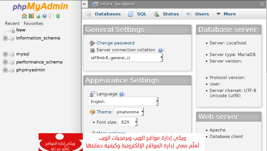 بعد تثبيت برمجية مماثلة، سيتم تثبيت PHPMyAdmin بشكل تلقائي. الآن يمكنك الدخول إلى PHPMyAdmin من خلال كتابة في شريط العنوان في المتصفح: