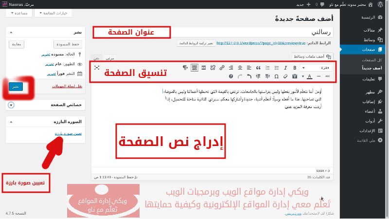 لا تختلف خيارات إضافة صفحة جديدة عن خيارات إضافة مقالة جديدة، إلاّ أن ليس لصفحات ووردبريس تصنيفات أو وسوم على عكس المقالات.