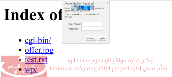 اذهب إلى الواجهة الأمامية لموقعك الإلكتروني، قم بتحديث الصفحة، حاول الدخول إلى المسار الذي قمت بحمايته بالخطوة السابقة. بعد القيام بذلك، لن يتمكن أي شخص من الدخول إلى المسار المحمي إلاّ الشخص الذي يعرف اسم المستخدم وكلمة المرور.