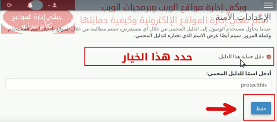 سيتم التوجيه إلى صفحة أخرى من خصوصية الدليل. قم بإدخال اسم للمسار الذي تريد حمايته (مثلاً: ProtectThis)، ثم حدد خيار “دليل حماية هذا الدليل” ثم انقر على * حفظ *